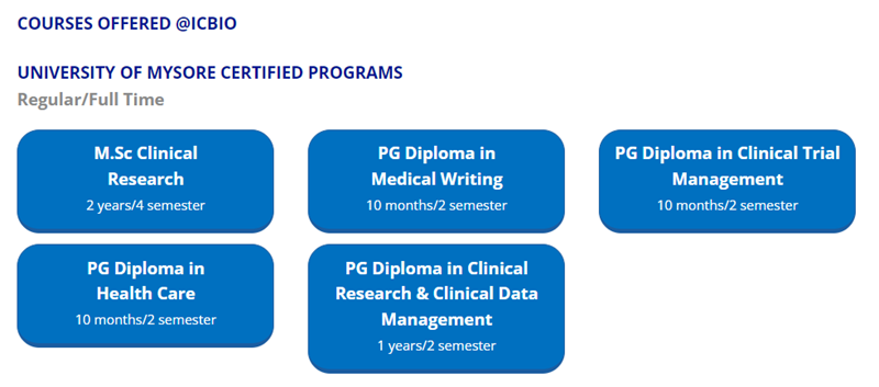 ICBIO is a Clinical Research Training and Service Provider offering various courses in Clinical Research to train Medical, Pharmacy and Life Science, Nursing students and professionals aspiring to make a career in Clinical Research. Our main aim is to make our students "Ready to be absorbed Clinical Research Professional". High quality and innovative methods are used by ICBio to offer clinical data managementtraining courses. Our courses shape the students in such a way that they are able to handle multiple tasks from designing protocols to preparing study reports thus enabling them to meet the growing demand for the Pharma, Life Sciences, Healthcare and Biomedical Industries. Our Institute is recognized / approved by the University of Mysore as a centre for Specialized studies.